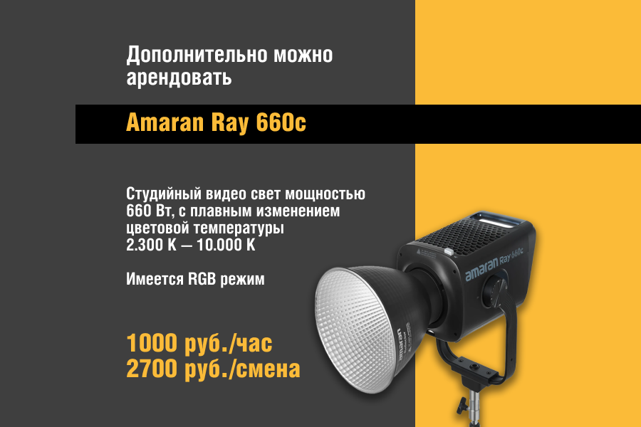 Дополнительно можно арендовать постоянный свет Aputure light storm cob 300d led 5500k, GreenBean DayLight 200 LED RGB и др.
